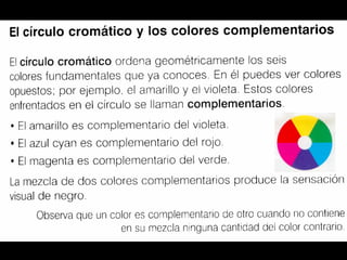 El documento describe cómo el color de un objeto parece cambiar dependiendo del fondo o la iluminación, y cómo se pueden mezclar colores primarios para obtener colores secundarios o negro. Explica que hay tres colores primarios que no pueden obtenerse mezclando otros colores, y que al mezclar dos colores primarios se obtienen tres colores secundarios.