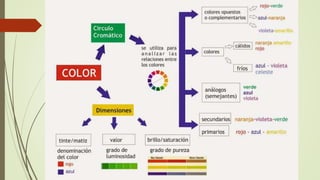 El documento describe las relaciones entre colores según el círculo cromático, incluyendo colores complementarios opuestos, colores análogos similares, colores primarios y secundarios, y colores cálidos y fríos. Explica que los colores complementarios están opuestos en el círculo y producen un efecto dramático, mientras que los colores análogos comparten un matiz común y producen un efecto armonioso. También describe que los colores primarios no pueden obtenerse por mezcla y los secund