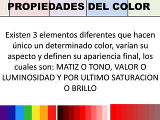 Existen tres propiedades que definen un color: tono, valor y saturación. El tono se refiere al nombre del color, el valor indica la luminosidad u oscuridad, y la saturación representa la intensidad del color. Los colores se clasifican en primarios, secundarios y terciarios dependiendo de si son colores puros o resultado de mezclas.