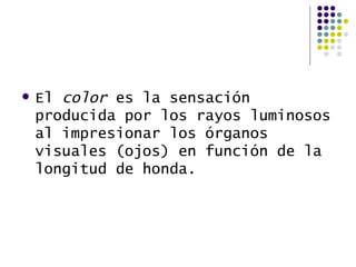 El color es la sensación producida por la luz al impactar en los ojos. Se origina por las diferentes longitudes de onda de la luz visible y se clasifica en colores primarios (rojo, amarillo y azul), secundarios (naranja, verde y violeta) y terciarios. Los colores se describen por su matiz, luminosidad y saturación y existen relaciones de complementariedad y contraste entre ellos.
