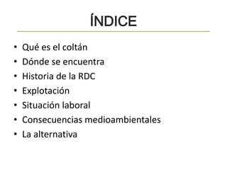 El documento describe el mineral coltán, que se encuentra principalmente en la República Democrática del Congo (RDC). El coltán es un metal estratégico utilizado en dispositivos electrónicos como teléfonos móviles y ordenadores. Su explotación en la RDC se ha visto empañada por conflictos armados, trabajo forzado y daños ambientales. Aunque el coltán es crucial para las industrias tecnológicas, su extracción en la RDC ha generado consecuencias negativas que es necesario abordar para lograr una alternativa sosten