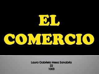 El documento define el comercio como la actividad socioeconómica de intercambiar bienes y servicios a través del mercado de compra y venta, ya sea para su uso, venta o transformación. Explica que el comercio incluye a productores, distribuidores/intermediarios y consumidores, y puede ser comercio interior entre un país o comercio exterior con la exportación e importación de bienes entre naciones. Además, la comercialización implica estrategias como el marketing mix, ventas, publicidad e imagen para competir en el mercado.