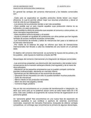 El documento describe los procesos de integración comercial entre países. Explica que el comercio internacional permite a los países especializarse en productos en los que son más eficientes y acceder a mercados extranjeros. También habla sobre la formación de bloques comerciales a través de tratados que brindan beneficios mutuos a los países miembros. Finalmente, analiza tanto las ventajas como las desventajas del comercio internacional para los países y las empresas.