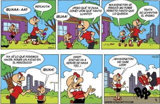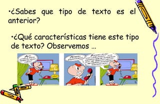 Este documento describe las características de los cómics o historietas. Explica que los cómics cuentan una historia en viñetas o cuadros de diálogos, con los diálogos de los personajes escritos en globos de texto de diferentes formas. También describe la estructura típica de un cómic, incluyendo viñetas, globos de diálogo, y sonidos o acciones de los personajes. Finalmente, explica los diferentes tipos de globos de diálogo y sus significados.