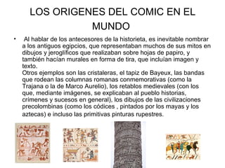 Este documento resume los orígenes del cómic en el mundo, desde los jeroglíficos egipcios y las pinturas rupestres hasta las primeras tiras cómicas en el siglo XIX. Explica que la historieta moderna surgió en 1895 con la creación del personaje The Yellow Kid por Richard F. Outcault en un periódico neoyorquino, estableciendo las bases del lenguaje del cómic actual mediante el uso de secuencias de imágenes, personajes permanentes y texto integrado. Finalmente, ofrece algunas definiciones breves sobre