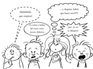Este documento habla sobre el uso del cómic como recurso didáctico en la educación. Explica que existen dos tipos principales de cómics educativos y describe sus ventajas, como desarrollar habilidades sociales y fomentar la creatividad. También menciona algunos inconvenientes como la dificultad de elaborar material propio y la necesidad de desarrollar un archivo de recursos. Por último, recomienda algunas herramientas digitales que facilitan la creación de cómics como Comeeko y Toondoo.