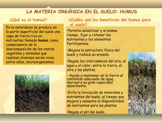 El documento describe el proceso de compostaje y los beneficios del compost. El compostaje imita el proceso natural de formación de humus en el suelo a través de la descomposición aerobia de materia orgánica por microorganismos. Un buen compost es de color oscuro, con textura suelta y olor a tierra; se puede utilizar como fertilizante o para proteger el suelo. Factores como la relación carbono/nitrógeno, aireación, humedad y temperatura influyen en el proceso de compostaje.