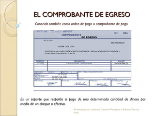 El documento describe el comprobante de egreso o pago, que es un soporte que respalda el pago de una cantidad de dinero mediante cheque o efectivo. Detalla las partes del comprobante como la fecha, beneficiario, valor y cuentas afectadas. También explica la importancia de firmar y archivar los comprobantes y sus soportes para identificar responsables y verificar la información.
