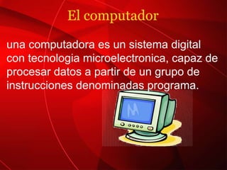 Un computador es un sistema digital que procesa datos a partir de instrucciones de programas. Está compuesto de hardware tangible como la unidad central de procesamiento (CPU), memoria RAM y ROM, disco duro, tarjeta madre y unidades de entrada. También incluye software intangible como sistemas operativos y aplicaciones que dirigen el hardware.