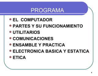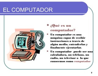 El documento describe las partes y el funcionamiento básico de un computador. Explica que la CPU es la parte inteligente que controla las operaciones, y que se requiere hardware y software para que funcione. También describe componentes como la memoria RAM y ROM, y sus funciones de almacenamiento temporal y permanente respectivamente.