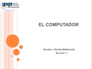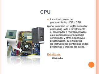 El documento describe los principales componentes de un computador, incluyendo la CPU, memoria RAM, disco duro, teclado, mouse, y varios tipos de monitores y proyectores. Define cada componente y provee su función básica. Las fuentes de información son artículos de Wikipedia.