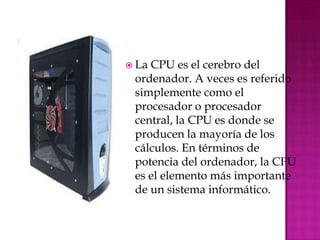 La CPU es el cerebro del ordenador donde se producen la mayoría de los cálculos y es el elemento más importante para la potencia del sistema. Los periféricos son dispositivos auxiliares conectados a la unidad central para comunicar la computadora con el exterior y almacenar información. La RAM es un tipo de memoria a la que se puede acceder aleatoriamente y es el tipo más común en ordenadores, mientras que el disco duro almacena datos de forma no volátil usando un sistema magnético.