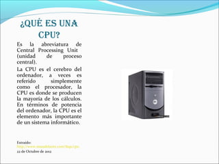 La CPU es el cerebro del ordenador y es donde se producen la mayoría de los cálculos. Los periféricos son dispositivos auxiliares conectados a la CPU como unidades de almacenamiento y dispositivos de entrada/salida. La memoria RAM es un tipo de memoria de acceso aleatorio que se usa comúnmente en ordenadores.