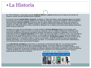 El documento describe la historia y evolución de las computadoras. Comenzó con máquinas mecánicas en el siglo 17 y fue avanzando hacia máquinas eléctricas y electrónicas. Figuras claves en el desarrollo incluyen a Babbage, Turing, y Atanasoff. Las computadoras modernas usan circuitos integrados y son mucho más pequeñas, rápidas y poderosas que las primeras máquinas.