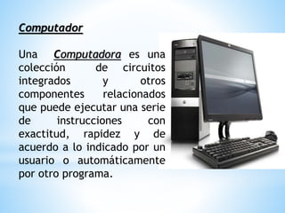 Un computadora es una colección de circuitos integrados y componentes que puede ejecutar instrucciones con precisión y rapidez según lo indicado por un usuario o programa. Está compuesto de hardware, que son los componentes físicos, y software, que son los programas. El software incluye software de sistema para controlar el hardware, sistemas operativos como Windows para gestionar recursos, y software de aplicación como Word y Excel.