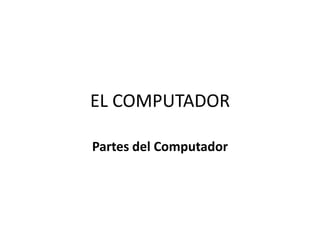 Este documento describe las principales partes de un computador, incluyendo el mouse, la pantalla, el teclado, el hardware y el software. El computador es una máquina electrónica que recibe datos de entrada, los procesa y convierte en información útil para el usuario a través de estos componentes.