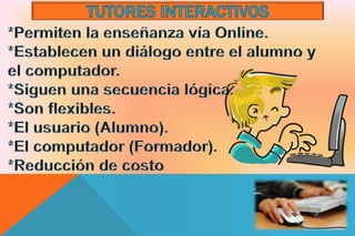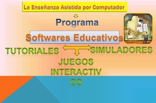 Este documento resume diferentes modelos y herramientas de enseñanza asistida por computadora. Describe modelos iniciales como la programación lineal y ramificada, así como herramientas más modernas como tutoriales, simuladores, juegos interactivos e hipermedia. También destaca ventajas como la adaptación a horarios y la motivación de estudiantes, así como desventajas como la limitación frente a un formador humano y los costos de equipos. Finalmente promueve el uso de wikis, redes sociales y otros recursos para una educación 2.0