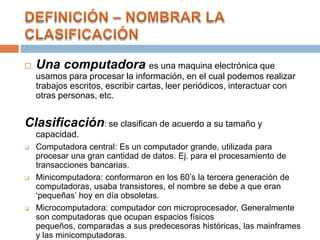 El documento describe las funciones básicas de una computadora, incluyendo almacenar, organizar, recuperar e intercambiar información. También explica los componentes hardware y software, y ofrece consejos ergonómicos para prevenir lesiones al usar una computadora por largos períodos.