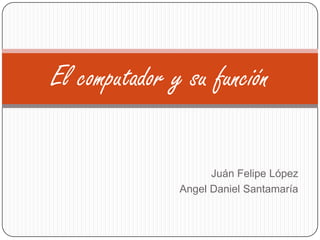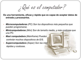 El documento define el computador como una herramienta eficaz y rápida capaz de aceptar datos de entrada y procesarlos. Explica que existen diferentes tipos de computadoras como las PC, minicomputadoras y supercomputadoras. Además, describe las funciones básicas de un computador como almacenar, organizar e recuperar información y transmitirla de manera rápida y segura entre usuarios. Finalmente, señala que el computador nos permite trabajar de manera más eficiente en diversos procesos como el uso de sist