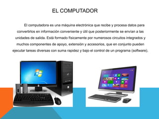 Este documento describe los principales componentes de un computador. Explica que un computador está formado por hardware (partes físicas como el procesador, la memoria y dispositivos de entrada y salida) y software (programas y aplicaciones). También detalla los diferentes tipos de dispositivos de entrada como el teclado y mouse, dispositivos de salida como la pantalla e impresora, y componentes internos como la tarjeta madre, procesador y memoria. Finalmente, distingue entre software de programación, aplicaciones y sistema.