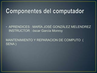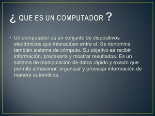 Este documento describe los diferentes tipos de computadoras, incluyendo supercomputadoras, mainframes, minicomputadoras y microcomputadoras/PC. También explica los componentes principales de una computadora como la placa madre, la CPU y la memoria RAM y ROM.