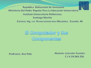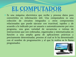 Un computador es una máquina electrónica que recibe datos, los procesa y convierte en información útil mediante programas. Está formado por hardware (componentes físicos como la CPU y periféricos) y software (instrucciones para funcionar como sistemas operativos y aplicaciones). El software incluye programas para tareas específicas, comunicación en redes, compartir software de forma gratuita, y aplicaciones verticales para funciones críticas de negocios.