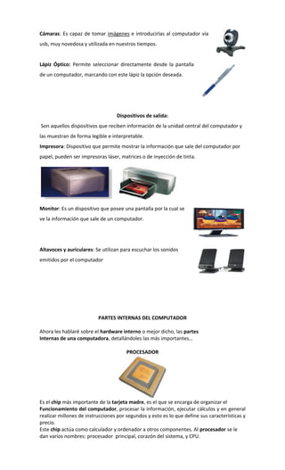 El documento describe las partes principales de una computadora. Explica que una computadora tiene cuatro funciones básicas: aceptar información, procesar datos, producir salidas y almacenar resultados. Luego detalla los dispositivos de entrada como el teclado, mouse, micrófono y escáner, y los dispositivos de salida como la impresora, monitor y altavoces. Finalmente, describe algunas de las partes internas clave como el procesador, memoria, tarjeta madre y disco duro.