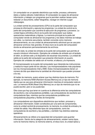 El documento describe los principales componentes de un computador, incluyendo la unidad central de procesamiento, la memoria, la unidad de entrada y salida. Explica que los computadores reciben, procesan y almacenan información de forma electrónica y existen diferentes tipos como de escritorio y portátiles. Además, detalla los distintos tipos de almacenamiento en un computador como la memoria interna, externa, disco duro y unidades ópticas, cada una con sus propias características de velocidad y capacidad.
