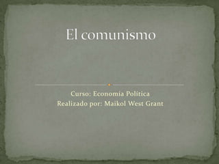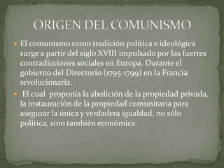 El documento resume la historia y los principios fundamentales del comunismo. Comenzó en el siglo XVIII en Europa occidental como una crítica a las desigualdades sociales y de propiedad. El Manifiesto Comunista de 1848 de Marx y Engels definió el comunismo como la abolición de la propiedad privada y la nacionalización de los medios de producción. Aunque algunos países como la antigua Unión Soviética se identificaron como comunistas, en la actualidad ya no quedan países que sigan estrictamente los ideales comunistas originales