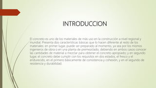 El documento proporciona información sobre el concreto. Explica que el concreto es uno de los materiales de construcción más utilizados y que está compuesto de cemento, arena y grava. También describe los diferentes tipos de concreto como el armado, simple y ciclópeo y sus proporciones típicas de mezcla. Finalmente, señala que el concreto se usa ampliamente debido a su resistencia al agua, capacidad de moldeo y bajo costo, y que tiene aplicaciones comunes en estructuras de ingeniería como ed