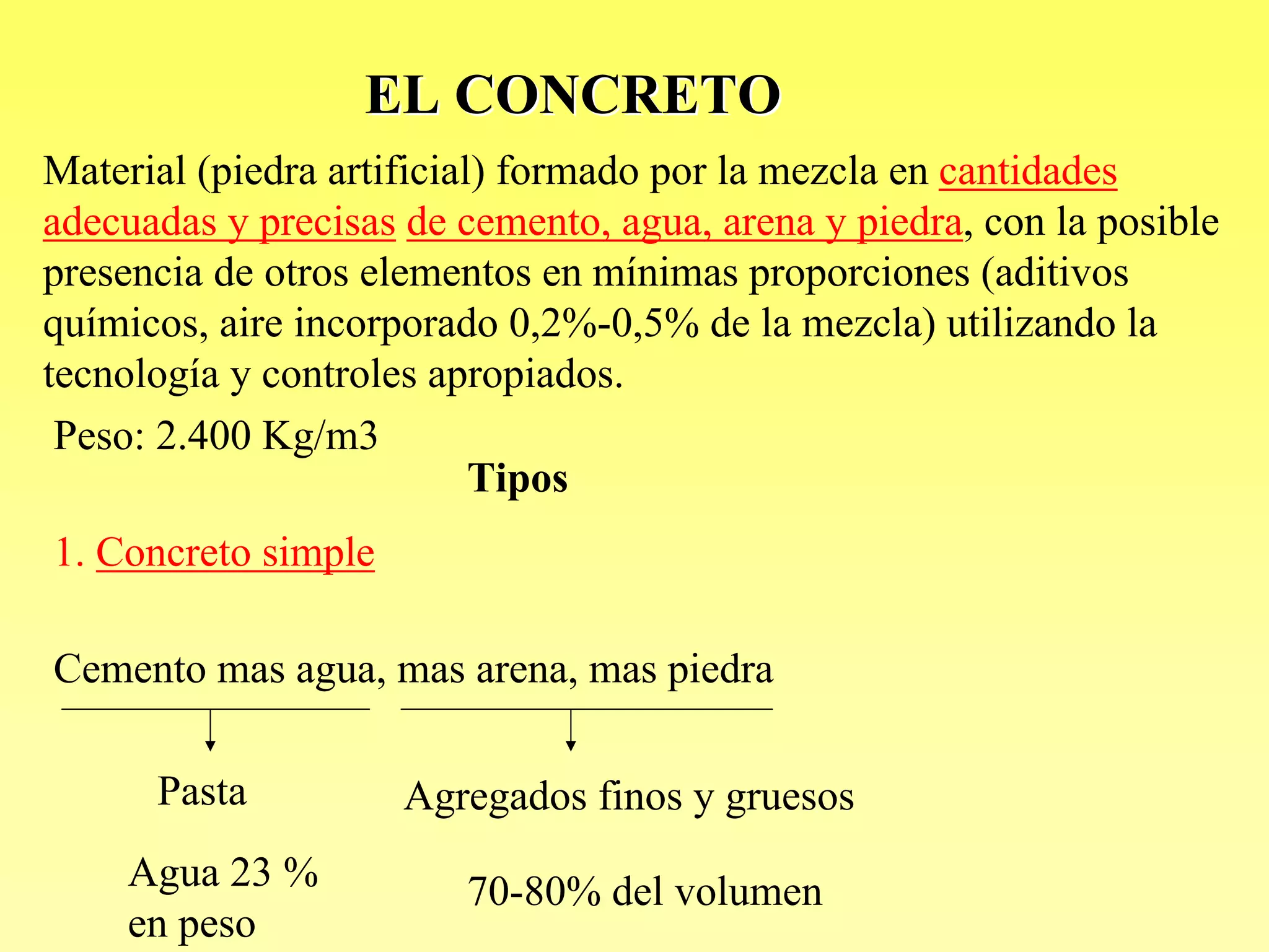 El documento describe las propiedades y componentes del concreto. El concreto se forma mezclando cemento, agua, arena y piedra en cantidades precisas. Existen diferentes tipos de concreto como el armado, aligerado o precomprimido. La calidad del concreto depende de factores como la relación agua/cemento, la dosificación y el proceso de fabricación. El concreto tiene usos estructurales y no estructurales gracias a su resistencia mecánica una vez fraguado.