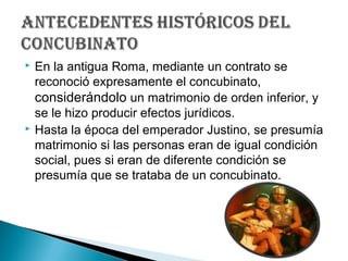 En la antigua Roma, el concubinato se reconocía mediante un contrato como un matrimonio de menor jerarquía, generando efectos legales. Este concepto ha evolucionado en Venezuela, donde se define como una unión estable no matrimonial entre un hombre y una mujer sin impedimentos legales para casarse. La normativa venezolana regula la inscripción, condiciones y terminación de estas uniones, estableciendo prohibiciones en ciertos casos.