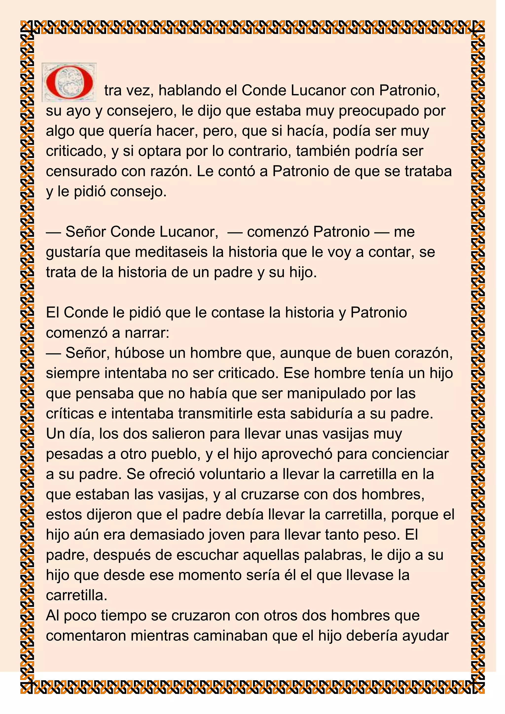 El Conde Lucanor le pide consejo a su asesor Patronio sobre algo que quiere hacer pero que podría ser criticado. Patronio le cuenta la historia de un padre y su hijo que llevan vasijas pesadas a otro pueblo y cambian quién las lleva dependiendo de los comentarios de la gente que se cruzan, hasta que el hijo le aconseja al padre hacer lo que considere mejor sin dejarse influir por las críticas. Patronio le aconseja al Conde hacer lo que crea mejor sin preocuparse por posibles críticas
