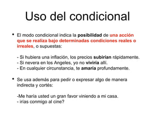 El documento describe el uso y las formas del condicional en español. El condicional indica posibilidades o suposiciones y se usa para expresar algo de manera indirecta o cortés. Tiene terminaciones como -ía, -ías e -ían y sigue patrones regulares como amar-ía o irregulares. El documento también incluye ejemplos de oraciones condicionales.
