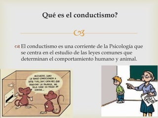 El conductismo es una corriente de la psicología que se enfoca en el estudio del comportamiento humano y animal, evitando el análisis de la mente o la conciencia. Fundado por John B. Watson y desarrollado por B.F. Skinner, sostiene que la conducta es el resultado de un condicionamiento a partir de consecuencias pasadas. Sin embargo, esta teoría plantea graves implicaciones éticas, ya que reduce al ser humano a un ente biológico moldeable por otros.