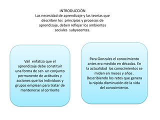 El documento describe la teoría del conectivismo como una teoría de aprendizaje para la era digital. El conectivismo integra principios de caos, redes, complejidad y auto-organización para describir el aprendizaje como un proceso que ocurre dentro de ambientes cambiantes no controlados completamente por el individuo. El documento también explica principios clave del conectivismo como que el aprendizaje depende de opiniones diversas, conectar fuentes de información, y que la habilidad de ver conexiones entre ideas es crucial para el aprend