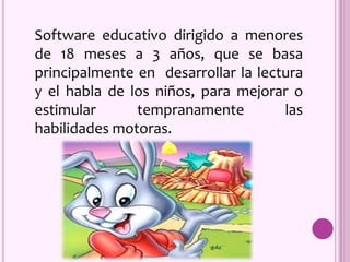 El documento resume un software educativo llamado "El Conejo Lector Primeros Pasos" dirigido a niños de 18 meses a 3 años. El software contiene 8 actividades que trabajan habilidades como el abecedario, formas, colores, música y más. Cada actividad usa gráficos coloridos e interactivos para enseñar de una manera entretenida y estimular el aprendizaje temprano.