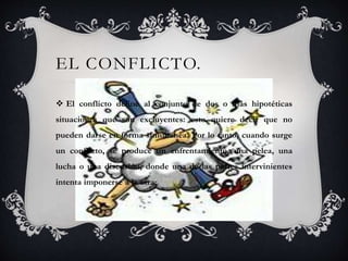 El documento describe los efectos del conflicto en los equipos de trabajo, los tipos de conflicto (funcional y disfuncional), las actitudes y estilos para enfrentar un conflicto (competencia, acomodación, evasión, cooperación, negociación), e incluye referencias bibliográficas.