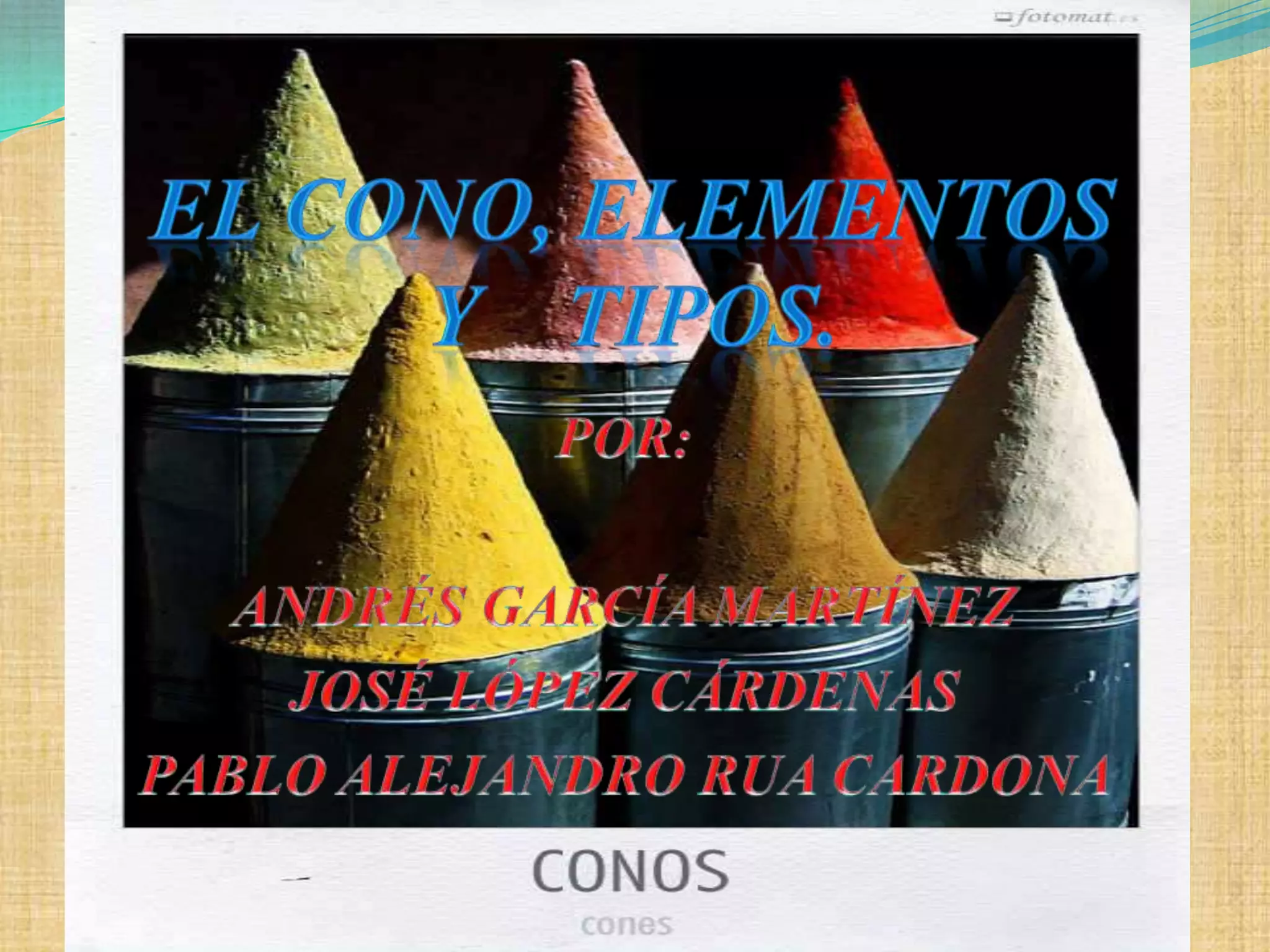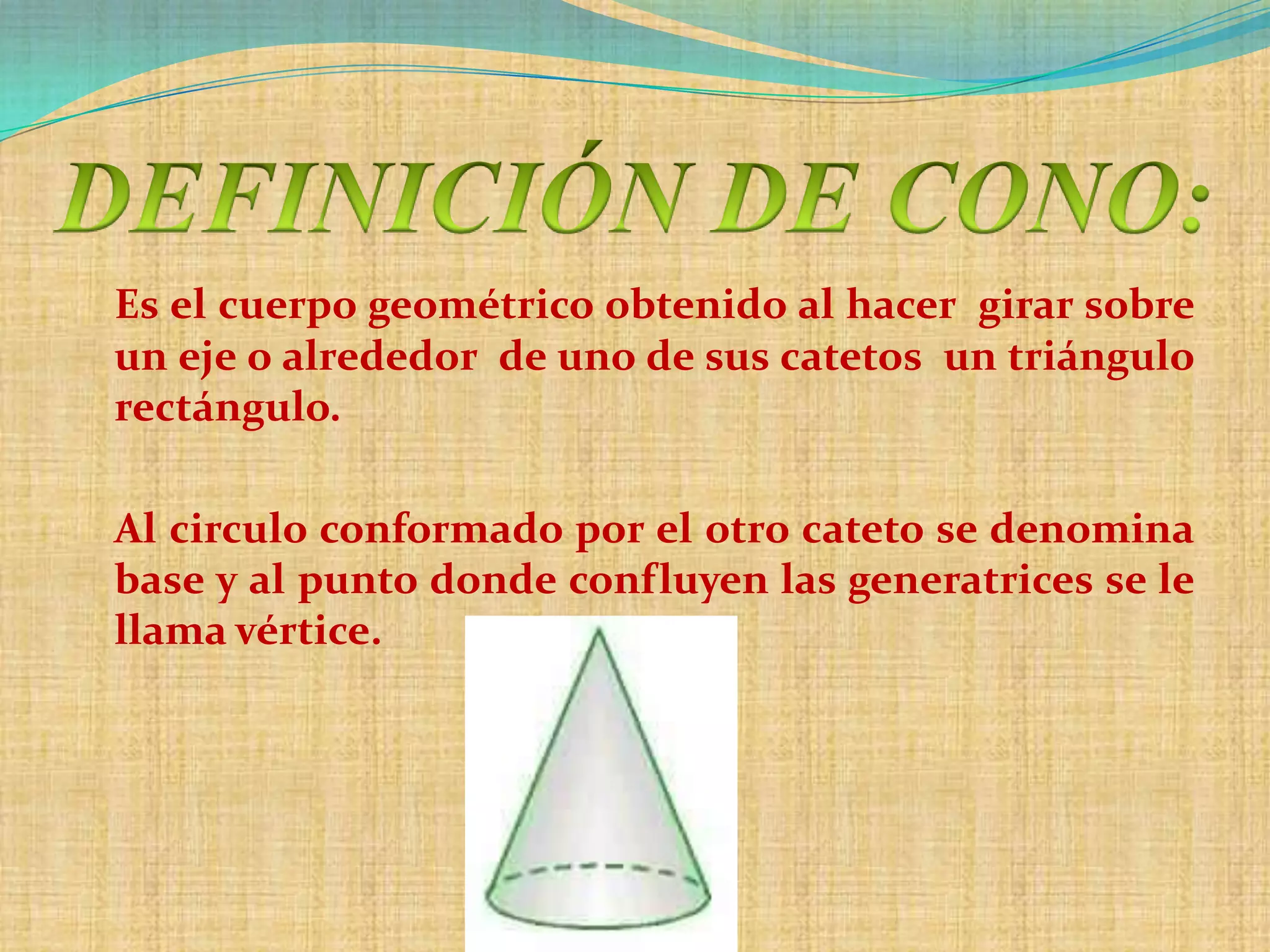 El documento define un cono como un cuerpo geométrico obtenido al hacer girar un triángulo rectángulo alrededor de uno de sus catetos. La base del cono es el círculo formado por el otro cateto y el vértice es el punto donde convergen las generatrices. Existen dos tipos de conos: rectos, con la altura en el centro de la base circular, y oblicuos, con la altura fuera del centro.