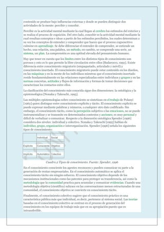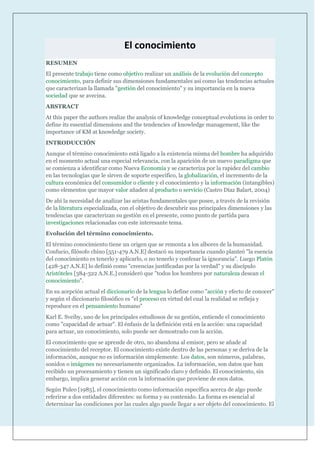 El documento analiza la evolución del concepto de conocimiento a través de la historia para definir sus dimensiones fundamentales y las tendencias actuales de gestión del conocimiento. Examina definiciones de conocimiento, clasificaciones de tipos de conocimiento, y procesos de conversión del conocimiento individual al colectivo. Concluye que el conocimiento tiene tres dimensiones: fuente (datos e información), procesamiento mental, y aplicación en un contexto.