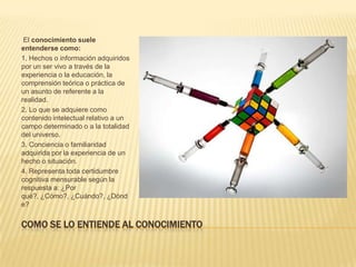 El documento define el conocimiento como información adquirida a través de la experiencia o educación, entendimiento teórico o práctico de un tema, o conciencia ganada por experiencia. Explica que el conocimiento ha permitido avances científicos y tecnológicos como la cibernética, robótica, telemática, ingeniería genética y nanotecnología. Define sujeto como la persona que adquiere conocimiento captando el mundo a través de la percepción, y objeto como fenómenos o elementos reales que son