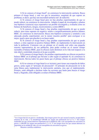 Este documento discute la importancia de evaluar la efectividad de las intervenciones médicas antes de implementarlas a gran escala. Propone 6 pasos que deben seguirse: 1) Determinar el riesgo basal, 2) Realizar pruebas experimentales para reducir el riesgo, 3) Evaluar los beneficios, riesgos, inconvenientes y costos de las pruebas, 4) Realizar una prueba piloto a pequeña escala, 5) Reevaluar los resultados del piloto, 6) Actuar con precaución solo si existe sospecha de daños graves m