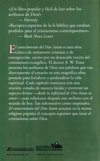 Este documento resume un libro clásico de testimonio cristiano escrito por A.W. Tozer sobre los atributos de Dios. El libro estudia de manera lúcida y reverente varios aspectos divinos como la infinitud, el amor y la santidad de Dios, relacionándolos con el mundo contemporáneo. El objetivo es restaurar en la mente religiosa popular el concepto supremo que tiene el cristianismo sobre Dios.