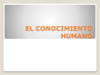 El documento trata sobre el conocimiento humano. Explica que el conocimiento se divide en sensible e intelectual. El conocimiento sensible se obtiene a través de los sentidos y nos da información concreta sobre el mundo, mientras que el intelectual nos permite entender conceptos abstractos y universales.