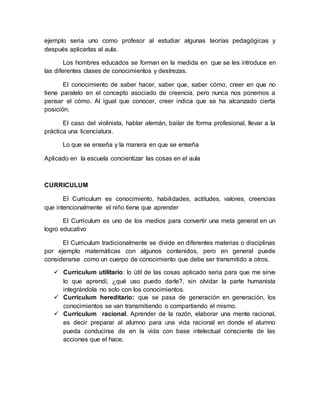 El documento discute el concepto de conocimiento y currículum. Define el conocimiento formal como el de las matemáticas y la lógica, y el conocimiento empírico como el de la ciencia. Explica que el conocimiento tiene una relación con la verdad pero no es totalmente verdadero, y que a veces aplicamos conocimientos en la vida práctica. También describe el currículum como los conocimientos, habilidades, actitudes y valores que los estudiantes deben aprender, y cómo puede dividirse en diferentes materias o disciplinas.