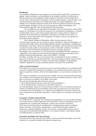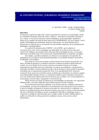 El documento discute el constructivismo como un posible nuevo paradigma filosófico para la educación superior en el siglo 21. Explica que el constructivismo surgió originalmente en las artes y las matemáticas y luego se expandió a la educación, psicología y otras áreas. Sostiene que el conocimiento se construye a través de la interacción entre las ideas previas de una persona y sus experiencias, y que el aprendizaje es un proceso social y activo de construcción del conocimiento en lugar de una mera transferencia de información.
