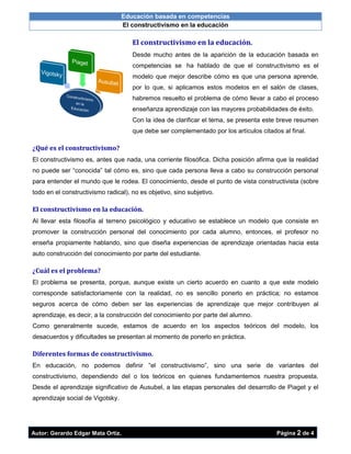 Este documento describe el constructivismo como una corriente filosófica que sostiene que el conocimiento es subjetivo y construido personalmente. Al aplicarlo a la educación, propone que los estudiantes construyan su propio conocimiento a través de experiencias de aprendizaje diseñadas por el maestro. Explica algunas técnicas como el aprendizaje colaborativo y basado en problemas para implementar este enfoque. Finalmente, recomienda varios recursos adicionales para comprender mejor cómo aplicar el constructivismo en el aula.