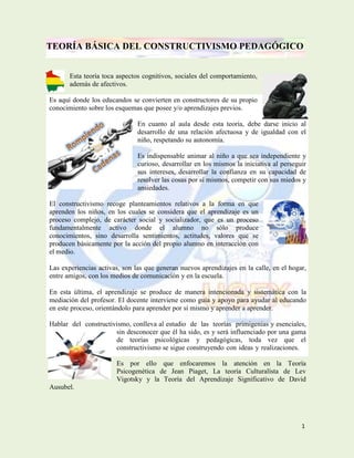 El constructivismo pedagógico enfatiza que los educandos son constructores de su propio conocimiento a través de experiencias activas y de interacción con su entorno, donde el docente actúa como guía. Se exploran teorías clave como la psicogenética de Piaget, que destaca la relación entre el desarrollo cognitivo y afectivo, y la perspectiva culturalista de Vygotsky, que resalta la importancia del contexto social y mediadores en el aprendizaje. Además, el aprendizaje significativo de Ausubel resalta la relación entre nueva información y conocimientos previos del estudiante, subrayando la necesidad de una enseñanza que considere la actividad interna del aprendiente.
