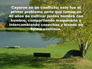 Este documento narra la historia de dos hermanos que vivían juntos en armonía por 40 años hasta que tuvieron un conflicto por un malentendido. Un carpintero desconocido ofreció construir una cerca para separarlos, pero en su lugar construyó un hermoso puente que los unió nuevamente. Los hermanos se reconciliaron, aprendiendo que el perdón y la armonía son más importantes que los rencores.