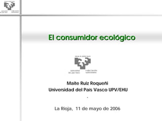 Este documento describe el consumidor ecológico y el consumo responsable. Resalta que el consumidor ecológico guía sus decisiones de consumo por criterios ambientales y traslada su preocupación ambiental a sus compras y comportamientos posteriores. También destaca la importancia de modificar hábitos a través de la compra y uso responsable, así como el papel de la educación y la colaboración para fomentar un comportamiento ecológico.